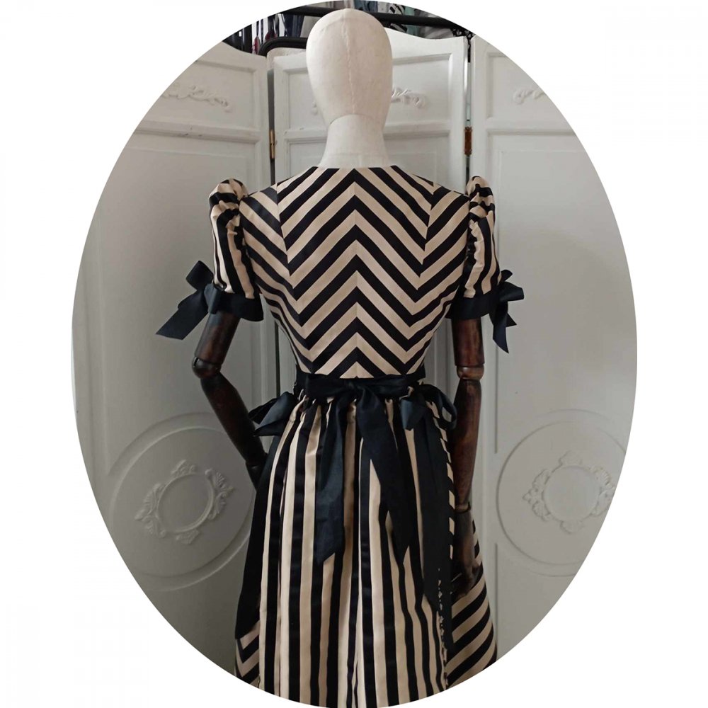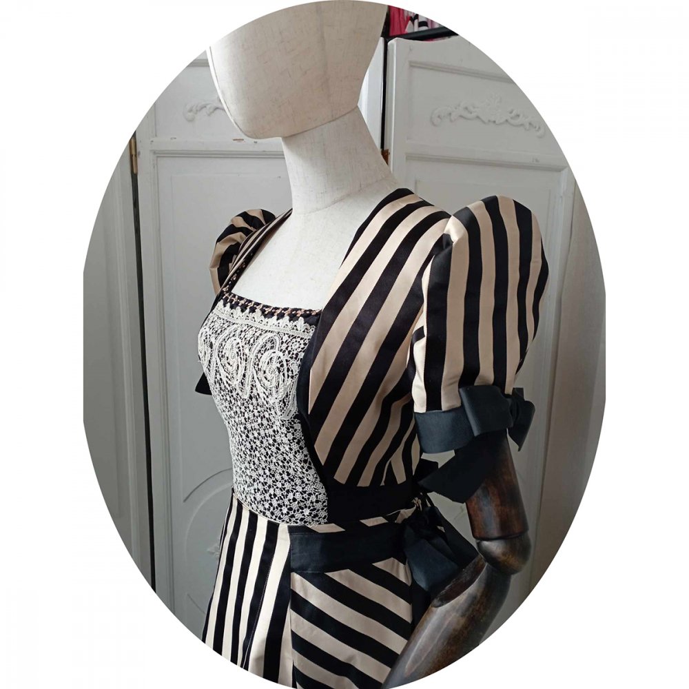 Ce boléro est coupé dans une étoffe de soie à rayures noires et beige, associée à du ruban noir, et doublé dans le même tissu.